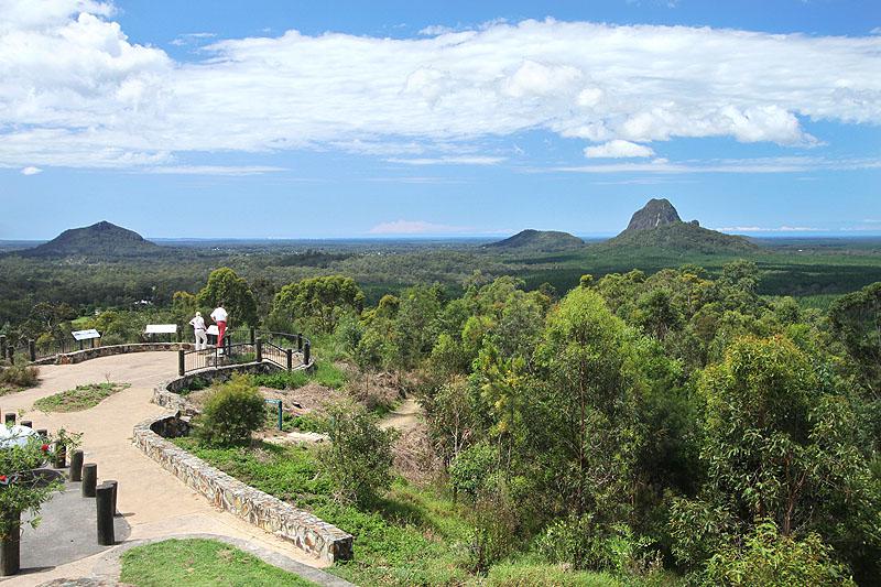 Étrangement, au départ de Brisbane, la visite de la Sunshine Coast commence par celle de son arrière-pays : à moins de 80 km de la capitale, se trouve le parc national des Glass House Mountains, une collection de pics trapus dont les silhouettes distinctives et étonnantes égaient un paysage autrement plat, fait de champs verdoyants et de forêts d’eucalyptus.